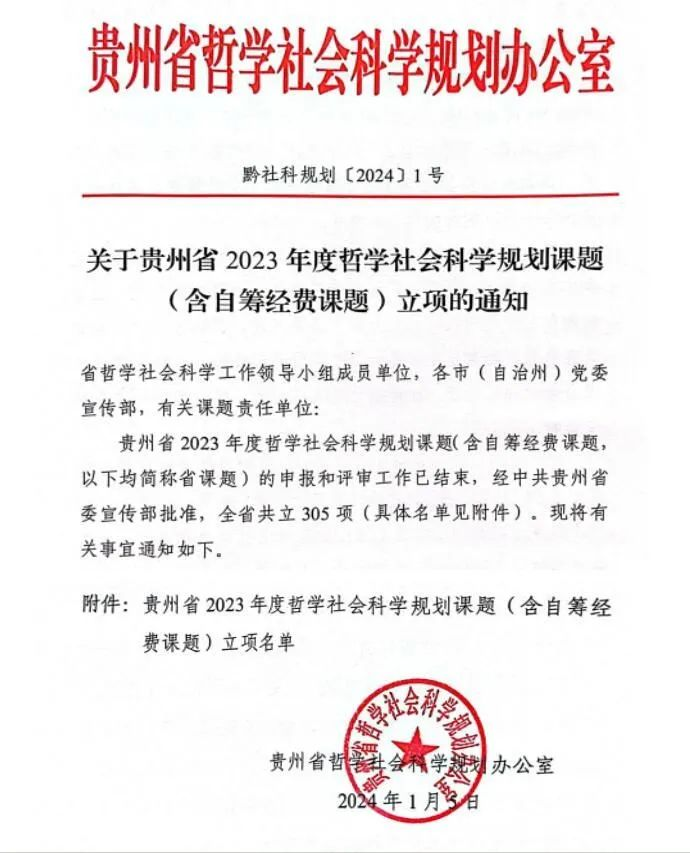 (本网讯 李银凤)2024年,贵州省哲学社会科学规划办公室《关于贵州省2023年哲学社会科学规划课题(含自筹经费课题)立项的通知》正式下文。乐游棋牌4项课题获批立项,申报立项率达36%。此次立项数量创乐游棋牌历史新高。近年来,学校高度重视各级各类课题的申报工作,积极有针对性地动员教师结合自身的研究专长和前期研究成果申报各级各类课题。这是学校不断加强有组织科研的成效体现。