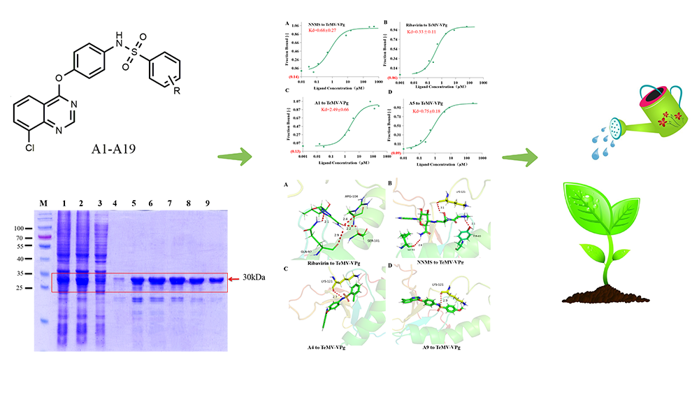 百香果是一种重要的经济作物,但病毒病害严重影响了百香果的产量和品质,限制了相关产业的发展。telosma mosaic virus (TeMV)病毒是百香果的一种严重病害,主要危害百香果的叶片和花朵,导致产量下降和果实品质减低。TeMV VPg蛋白在病毒感染中起着重要作用。该研究通过设计和合成具有喹唑啉和磺酰胺结构的抗病毒化合物,测定靶标蛋白TeMV VPg与合成的小分子之间的亲和力,建立靶标与小分子之间的互作模型,并通过生物活性测试验证,筛选活性较高的抗TeMV病毒化合物。研究结果表明,TeMV VPg在大肠杆菌中,IPTG浓度为0.8 mM,诱导温度为25 ℃时,TeMV VPg蛋白表达最佳。化合物A4、A6、A9、A16和A17对TeMV VPg具有良好的结合亲和力,Kd值分别为0.23、0.034、0.19、0.086和0.22 μM。LYS 121是关键的氨基酸位点。化合物A9可抑制了本氏烟草中TeMV VPg的表达。该研究对开发新型病毒性病害防控药剂具有重大的理论意义及应用价值。