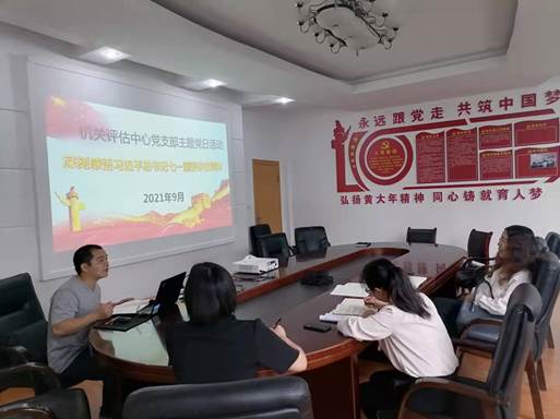 党支部书记邵芳强调,要把学习贯彻总书记“七一”重要讲话精神作为当前理论武装工作的重中之重和党史学习教育的核心内容。对于总书记“七一”重要讲话,通读一遍是不够的,评估中心全体人员要通过线上或线下方式反复研读,要聚焦总书记“七一”重要讲话中一至两个专题开展专题学习研讨,深刻领会精神实质,把握核心要义。