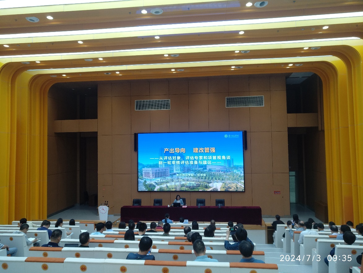 本网讯(图/文 夏黄晶)为学习本科教育教学审核评估建设工作的宝贵经验、先进理念,学校本科教育教学审核评估评建办公室(简称评建办)于2024年7月3日上午在图书馆报告厅组织召开本科教育教学审核评估专家专题辅导会。评建办邀请贵州师范学院生物科学学院院长任翠娟教授作《产出导向,建改管强——从评估对象、评估专家和项管视角谈新一轮审核评估准备与建议》的专题辅导报告。乐游棋牌潘良明、安艳玲出席会议,各职能部门负责同志,各学院(中心)党总支书记、院长、教学院长,评建办全体副主任及成员,校督导组组长,教务处班子成员及各科室负责人,教学质量评估监控中心全体人员参会。