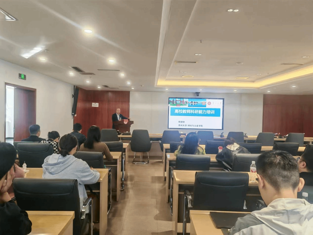 贵州大学材料与冶金学院副院长、博导、教授陈朝轶应邀为全体新进教师作“高校教师科研能力培养”专题培训,陈教授从科研能力的定义、构成要素、科研如何选题与课题设计等方面做了全面详细的讲解。他结合自己多年的科研工作经历与管理工作实际鼓励和引导各位新进教师在科研方面投入更多的热情和精力,努力成长为一名优秀的科技工作者。