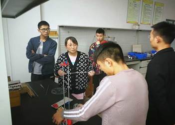 图为周琴老师在创新制作室讲解学生制作无碳小车