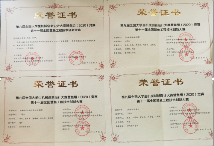 第九届全国大学生机械创新设计大赛慧鱼组(2020)竞赛于2020年10月在温州大学举行。贵州理工学院工程训练中心组织3支学生队伍参赛,经过评审获得全国二等奖2项,全国三等奖1项。工程训练中心教师周琴被评为优秀指导老师。