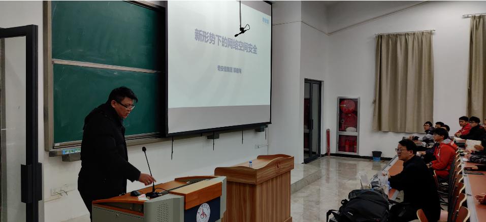 主讲人郭祖甸顾问在网络空间安全领域有着丰富的经验和知识,他从六个方面:一、什么是网络安全?二、新形势下的新体系。三、为什么要建网络安全类专业。四、为什么要现在建设?五、网络安全人才需求。六、专业课程体系如何建设?深入浅出的为学生们讲解了新形势下的网络空间安全。