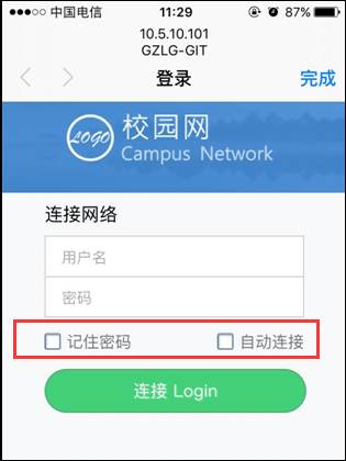 由于不同厂商对设备系统的优化程度不同, 部分设备自带的浏览器可能不能正常显示登录信息(华为手机此种情况比较多),如登录界面中缺失“记住密码”复选框或“自动连接”复选框,如下图红色框中所示选项缺失: