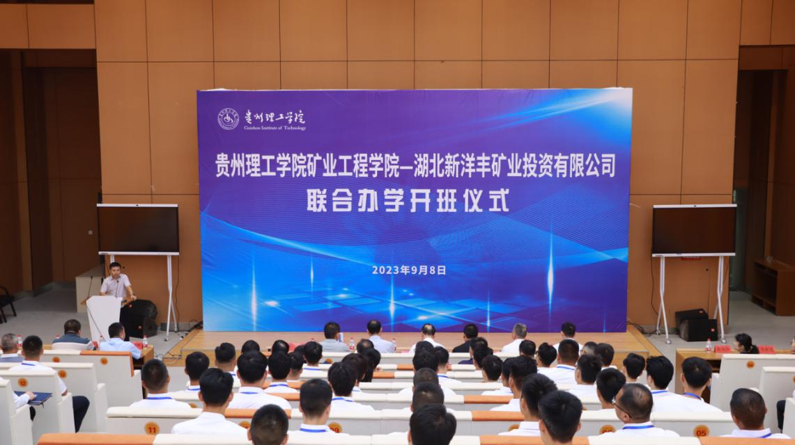 本网讯 (矿业工程学院)2023年9月8日,贵州理工学院矿业工程学院—湖北新洋丰矿业投资有限公司联合办学开班仪式在贵州理工学院举行。贵州省能源局、国家矿山安全监察局贵州局、纳雍县能源局、贵州理工学院、湖北新洋丰矿业投资有限公司、中铁隧道局集团有限公司有关负责同志出席开班仪式。