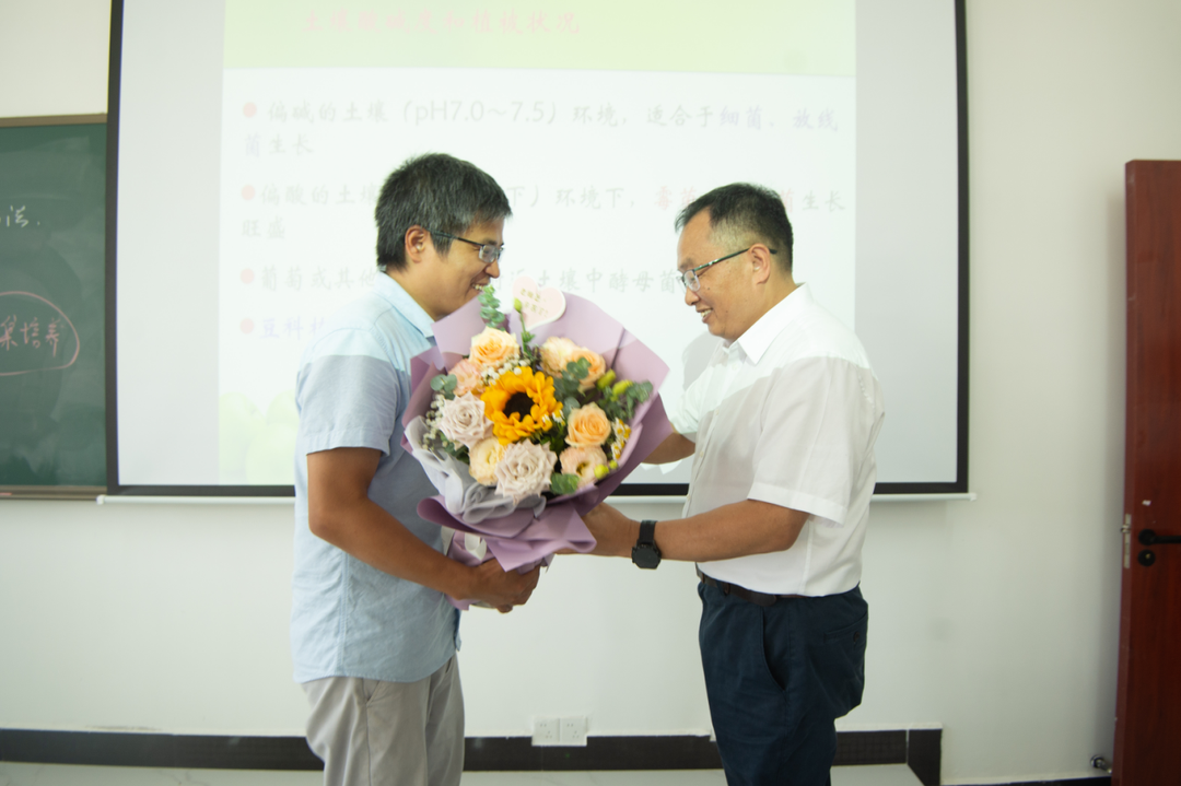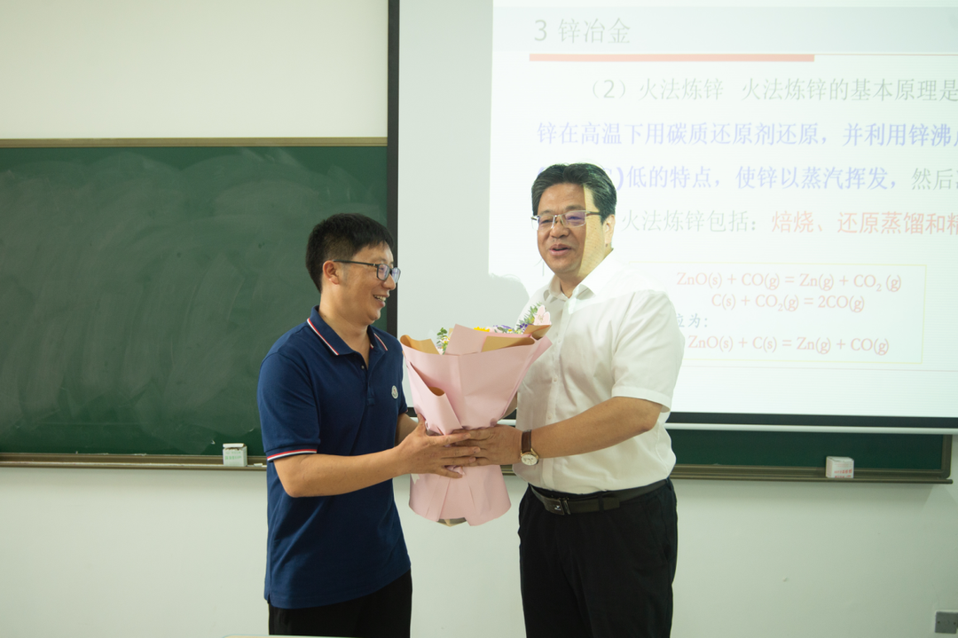 会议对学校评选出的2022—2023 学年优秀辅导员、2022年度全校师德先进个人、2023年全校优秀教师及优秀教育工作者、贵州省人民政府30年教龄荣誉证书获得者颁奖,学生代表向各位教师先进个人敬献鲜花。潘良明为新进教师代表佩戴校徽。