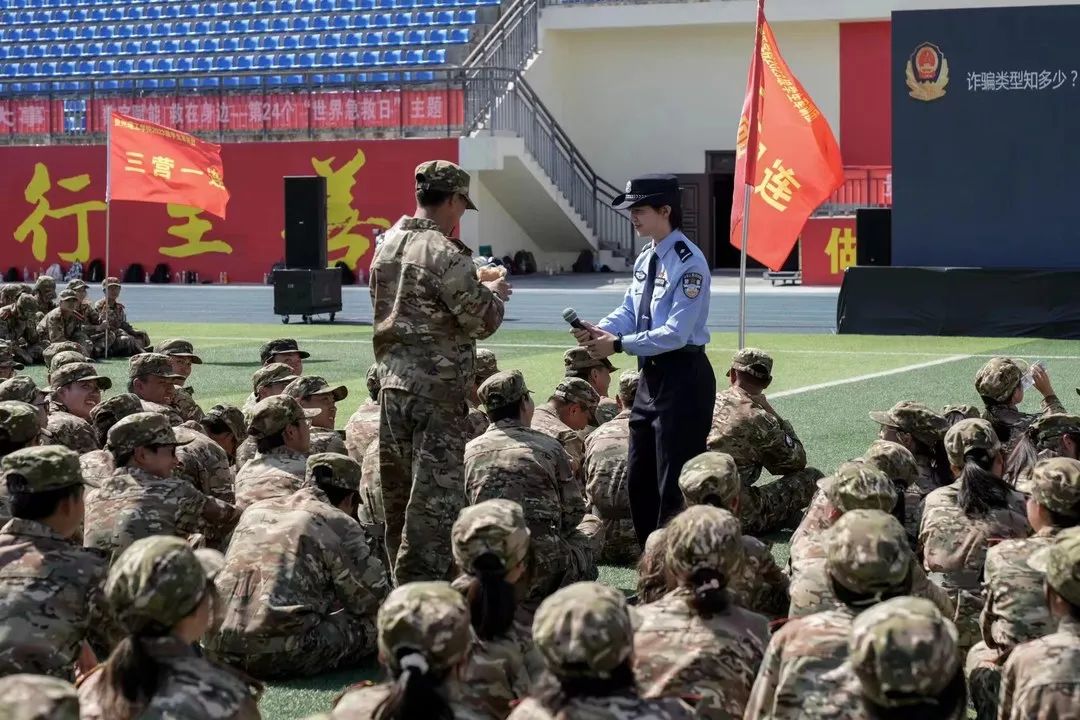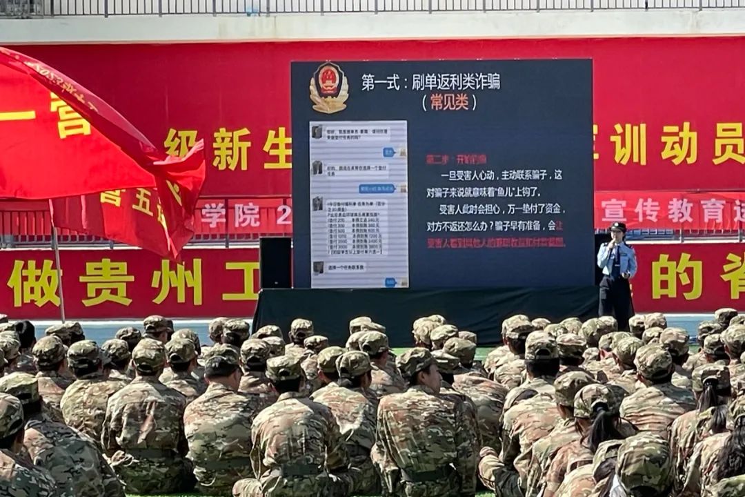 贵安新区公安局侦防中心反诈宣讲及网络安全宣讲警官袁孟蜻对军训新生开展“防范网络电信诈骗”专题宣传教育,针对新生群体特点,以大量真实案例为基础,介绍当前涉生诈骗案件的特点和当前高发电信网络诈骗的形式,提升新生防范意识。