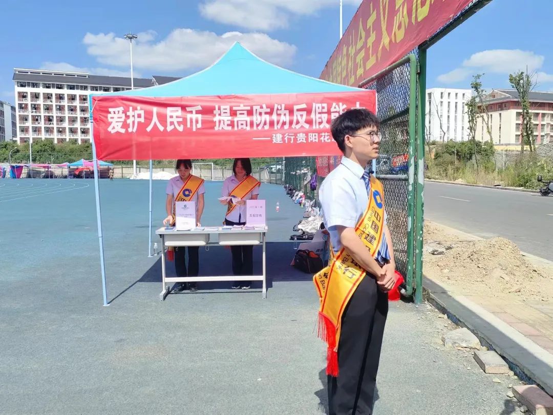银行工作人员在体育场设置反诈宣传点,通过各种宣传方法向新生普及反诈常识。
