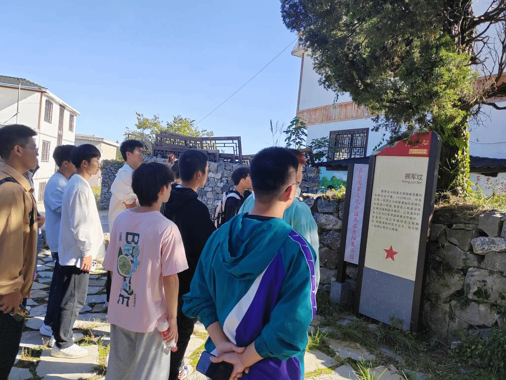 中央红军在贵州的革命活动,铸造了中国红色革命伟大的转折,红军长征兵临贵阳战役更是其中不可或缺的一页。兵临贵阳展示园是以中央红军兵临贵阳战役为主题,集主题展示、文旅融合、红色教育、民俗文化等为一体的红色研学目的地和长征国家文化公园贵州省南片区集散地。进入园区,能明显感受到长征国家文化兵临贵阳核心展示园区的庄重和威严。在红军牺牲地的碑前,同学们重温入团誓词,共青团员的使命和光荣油然而生。重走部分长征路,感受战士们当年走过的乡路、生活过的村落,民风淳朴的村庄巷道中还保留着当时红军驻留时留下的标语。同学们深入了解了拥军坟、六方井等事迹,大家表示作为新青年,学习先烈们在艰苦岁月里不屈不挠的斗志和革命精神,把长征精神代代相传,为祖国奉献!