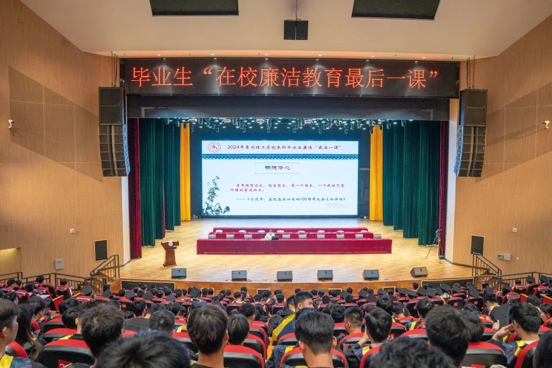 6月28日上午,在贵州理工学院蕴华楼大礼堂,学校以“崇廉守正行稳致远”为主题,开展 2024 届毕业生“在校廉洁教育最后一课”活动,作为扎实开展党纪学习教育,建设“清廉理工”廉洁文化品牌的重要环节。学校党委副书记高勇,党委委员、纪委书记、监察专员贺梦依出席活动,并为毕业生作廉洁教育课。