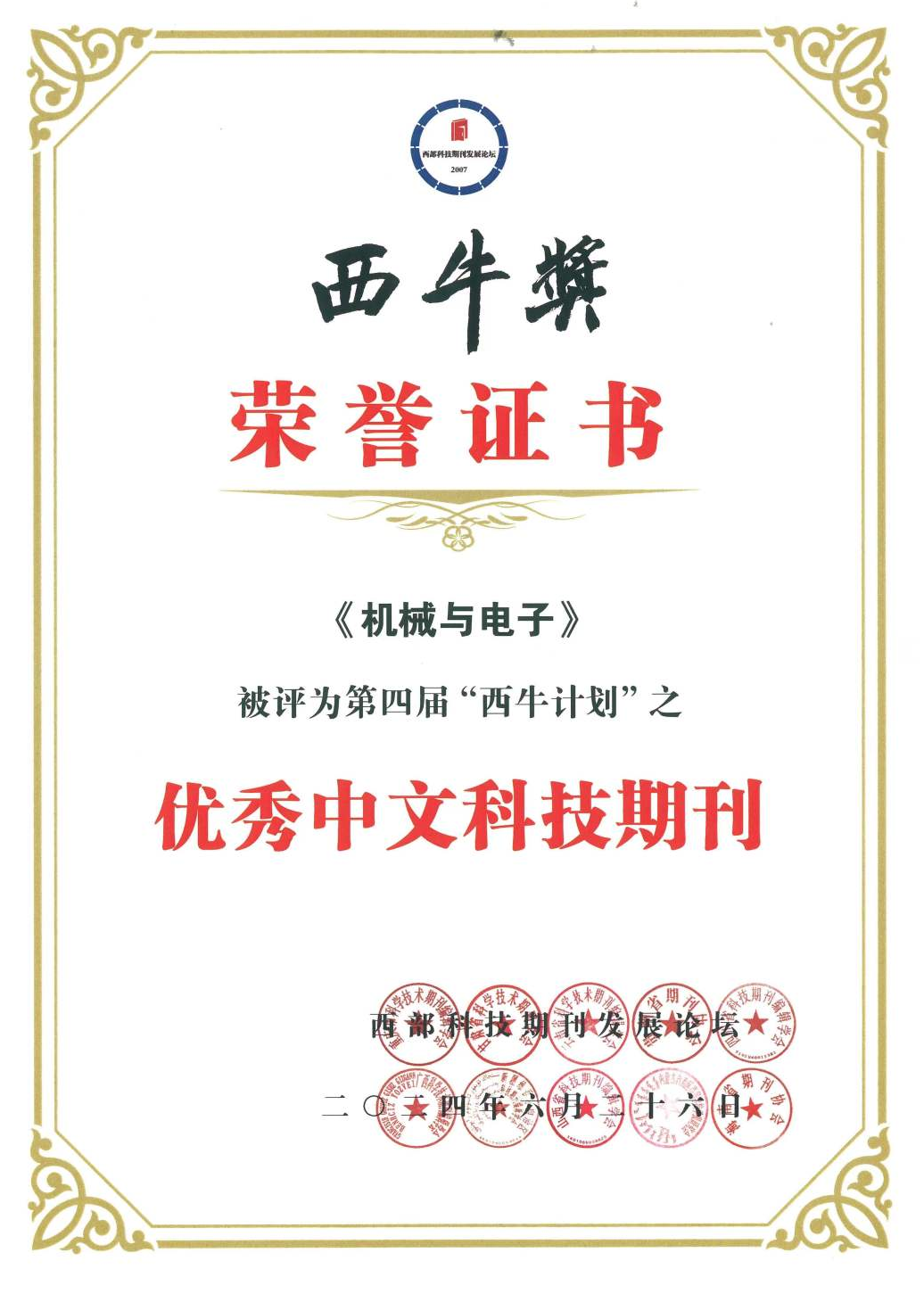《机械与电子》是面向国内外发行的全国性期刊。致力于贯彻党和国家关于机械应用电子技术、计算机技术的方针政策,介绍电子技术、计算机技术在机械中的应用和机械电子的新产品、新技术、新工艺,传递机械电子技术经济信息,推动机械电子产品更新换代,促进工业控制、工业自动化和机电一体化的发展。此次获奖,是对《机械与电子》期刊办刊质量和期刊影响力的肯定和鼓励。今后,《机械与电子》期刊将继续贯彻落实习近平总书记关于新时代推动西部大开发的重要指示精神,加快发展科技期刊新质生产力,不断增强编辑出版能力,提高编辑出版质量,提升学术影响力,继续为广大专家学者和学院教学科研服务。