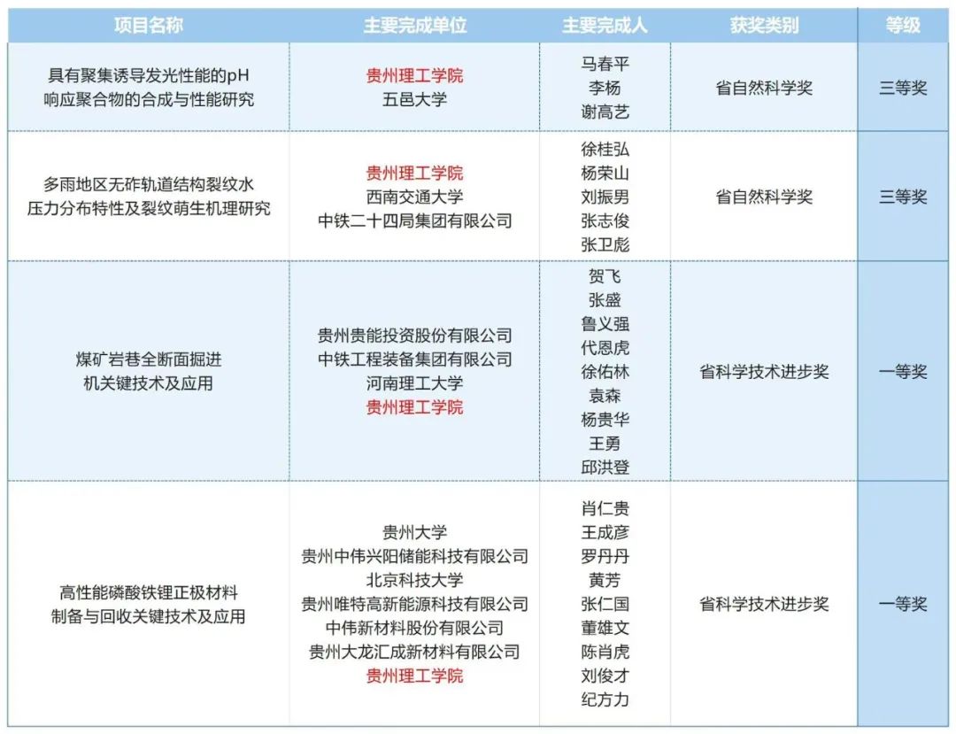 7月2日,2023年度贵州省科学技术奖励名单揭晓,贵州理工学院4项成果获奖,牵头的“具有聚集诱导发光性能的pH响应聚合物的合成与性能研究”“多雨地区无砟轨道结构裂纹水压力分布特性及裂纹萌生机理研究”2个项目,获贵州省自然科学奖三等奖;参与的“煤矿岩巷全断面掘进机关键技术及应用”“高性能磷酸铁锂正极材料制备与回收关键技术及应用”2个项目获贵州省科学技术进步奖一等奖。