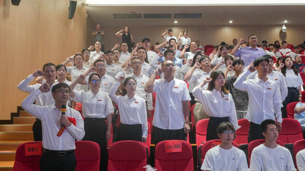 “我是一名光荣的人民教师,我庄严宣誓,忠诚党的教育事业……”新进教师在材料与能源工程学院的校级教学名师何杰军老师的带领下光荣宣誓,铿锵有力的誓言表达了新进教师为理工的明天一起努力的庄严承诺。
