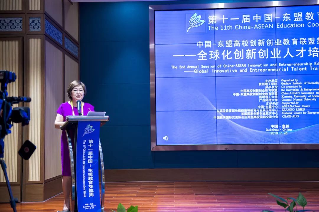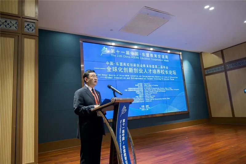 本网讯(党委宣传部 巫敏/文 陈智海 邹坤 秦志颖/图)7月26日,由贵州理工学院主办,中国高校创新创业教育联盟、中国-东盟高校创新创业教育联盟、昆明理工大学、广西师范大学协办的第十一届中国东盟教育交流周开幕期“中国—东盟百名校长牵手未来系列活动”之“中国—东盟高校创新创业教育联盟第二届年会——全球化创新创业人才培养校长论坛”在交流周永久会址二楼红枫厅举行。本次论坛以“协同育人,融合发展——中国—东盟高校创新创业人才培养探索实践”为主题,旨在探索新形势下高校创新创业教育发展思路,“一带一路”背景下高等教育深化改革路径,共同推进高等教育人才培养质量。