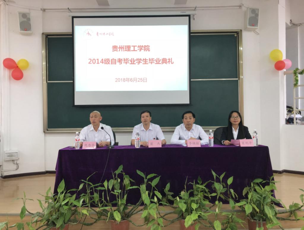 本网讯(继续教育学院 卢源源) 6月25日上午,贵州理工学院继续教育学院在学院307教室举行了“青春风华,记忆留夏”为主题的2014级自考学生毕业典礼。副校长梁杰出席毕业典礼,继续教育学院全体班子成员和全院教职工、班主任参加典礼。
