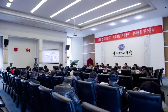 校党委书记曾羽在讲话中指出,中央和省委系列重大文件的出台,进一步明确要求全国人民要坚决维护以习近平同志为核心的党中央权威和集中统一领导,意义重大。全校党员干部要认真学习,深刻领会,以更高标准、更实举措,驰而不息纠正“四风”,加强作风建设,全面从严治党,在习近平新时代中国特色社会主义思想的指引下,坚决维护以习近平同志为核心的党中央权威和集中统一领导,为开创百姓富、生态美的多彩贵州新未来而努力,为建设西部一流、人民满意的高水平理工大学而矢志不渝。全校党员干部一是要牢固树立“四个意识”,不断提升政治能力。要树立正确的政治意识、大局意识、核心意识、看齐意识,进而把握正确政治方向、锻造过硬政治定力、坚定正确政治立场、更好肩负政治担当。二是要旗帜鲜明讲政治,切实增强“四个自信”。全体党员干部一定要坚定中国特色社会主义道路自信、理论自信、制度自信、制度自信。三是要讲规矩守纪律,坚决做到“四个服从”。做到“四个服从”,首要的是要在思想上政治上行动上与以习近平同志为核心的党中央保持高度一致;关键的是要牢记党员身份,自觉在党的领导下履职尽责;根本的是要坚持执行民主集中制,把对党忠诚融入血液中。他强调,全校党员领导干部要按照总书记指出的:用信念、人格和实干立身。要深刻理解“直面问题是勇气,解决问题是水平”的内涵。要确立崇高理想,要讲党性、重品行、做表率,要有积极的进取精神、有为党和人民建功立业的强烈渴望,要以肯干敢干实干苦干的精神诠释对党的忠诚。要学用结合,做到会上学透精神,会后抓落实、见行动。要坚持底线思维,严格执行纪律,抢抓机遇,把握好政策依据,以结果和问题为导向,查摆学校建设发展中的突出问题,做好整改。领导班子成员要勇于担责,当好领头雁,发挥示范带头作用。全校师生员工要为将学校建成西部一流、人民满意的高水平理工大学而不懈努力,不辜负省委省政府给予的重托,不辜负新时代赋予的职责使命。