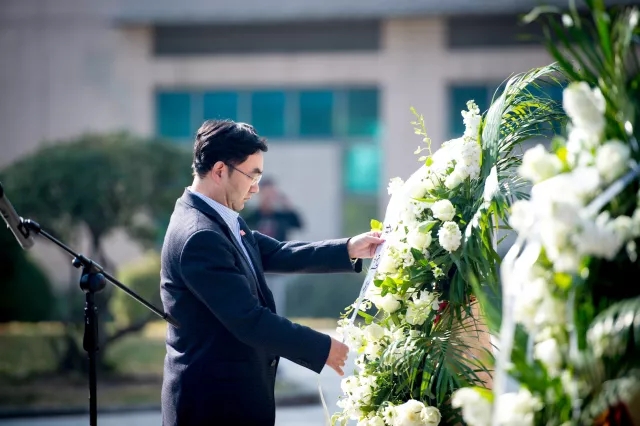 活动伊始,校党委书记曾羽同志神情肃穆走到摆放在毛主席塑像前的花篮旁,仔细地整理花篮上的缎带。缎带上写着“永远怀念毛主席、永葆共产党员先进性”。