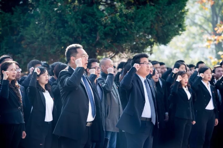 在毛主席塑像前,鲜红的中国共产党党旗在阳光下格外庄严。面对党旗,党员高举右手,庄严宣誓:“我志愿加入中国共产党,拥护党的纲领,遵守党的章程……”铿锵有力的宣誓声响彻空中,激昂洪亮的12句入党誓词传达出身为中共党员的神圣感和自豪感,让现场党员深刻感受到肩上的责任和使命。