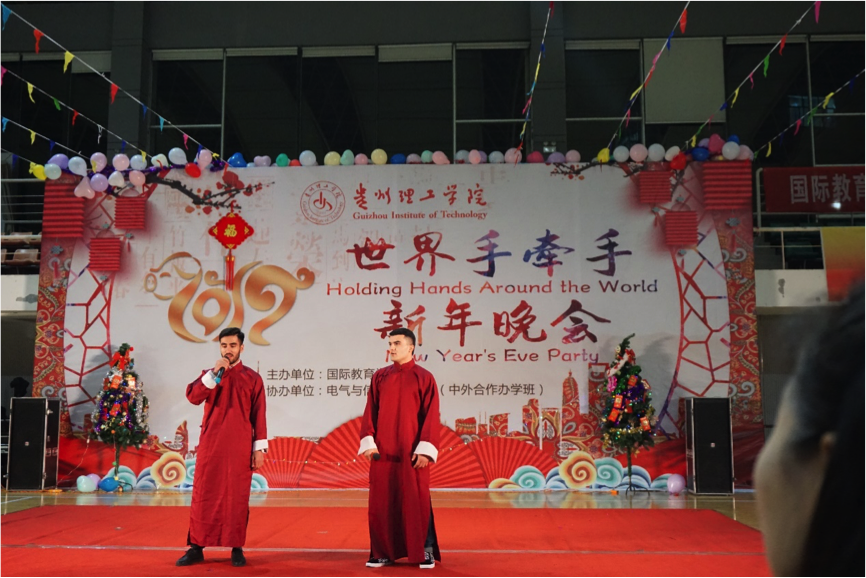 贵州理工学院副院长宋建波、胡兴灿,院长助理李滚及国际教育学院、电气与信息工程学院师生参加了新年晚会。