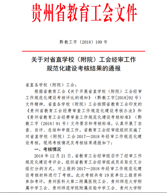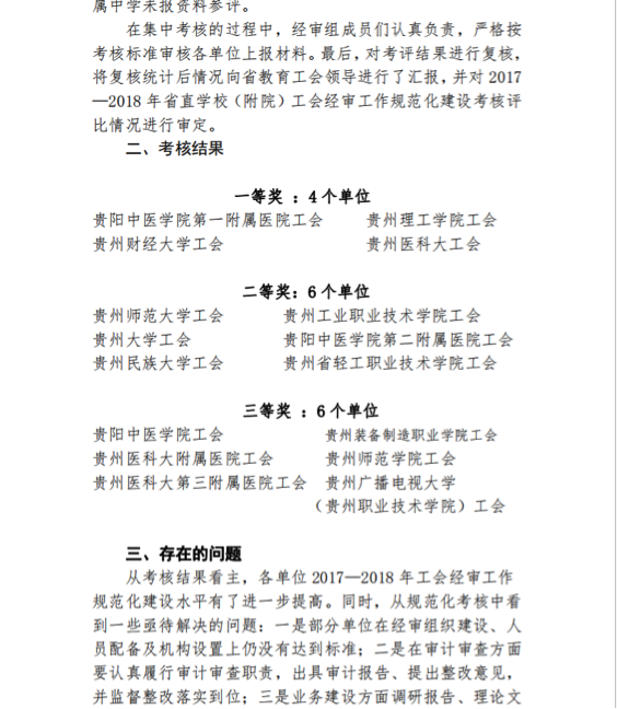 本网讯(校工会 燕梓)日前,在省教育工会组织的省直学校(附院)工会经审工作规范化建设考核评比中,贵州理工学院工会获得一等奖。
