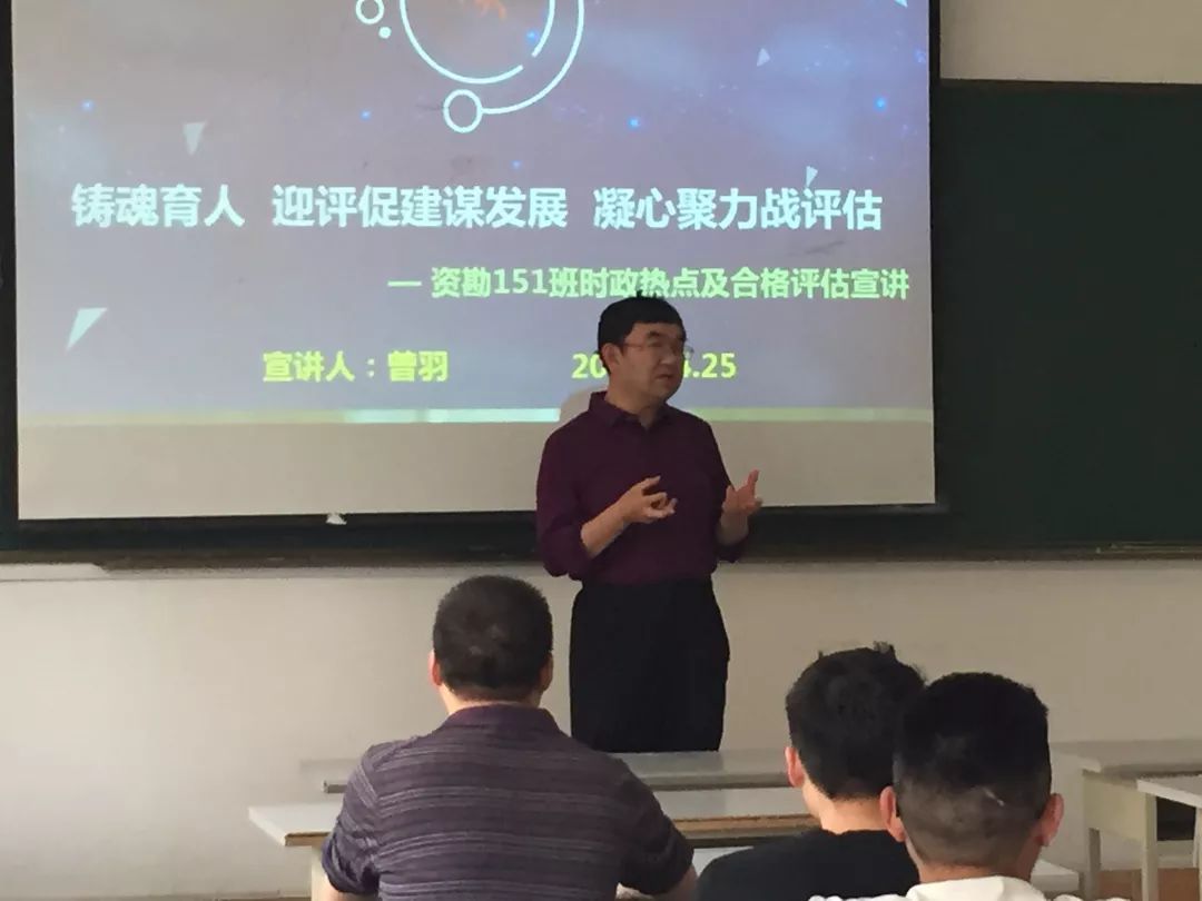 本网讯(资源与环境工程学院 龙汉生)乐游棋牌4月25日下午,乐游棋牌党委书记、资源与环境工程学院资勘151班班级导师曾羽深入该班开展专题宣讲活动,曾羽以《铸魂育人 迎评促建谋发展 凝心聚力战评估》为题开展本科合格评估知识宣讲,资环学院党政班子成员与资勘151班全体同学全程聆听了宣讲。