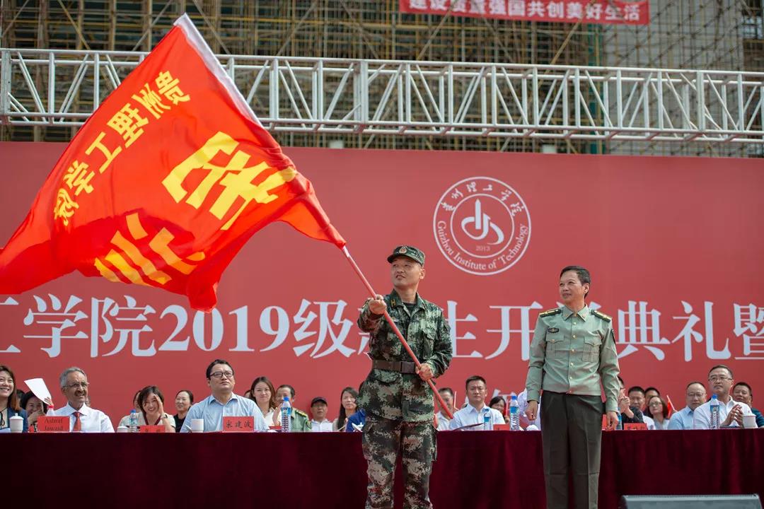 贵州理工学院副院长、军训团团长梁杰宣布成立2019级学生军训团的决定,并向军训团司令部授旗。