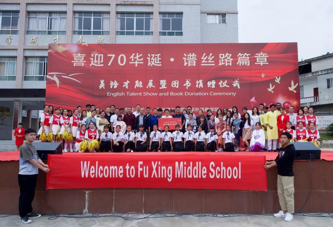 曾羽一行还参加了由乐游棋牌大学外语教学部与复兴中学开展的英语才能展暨图书捐赠活动。