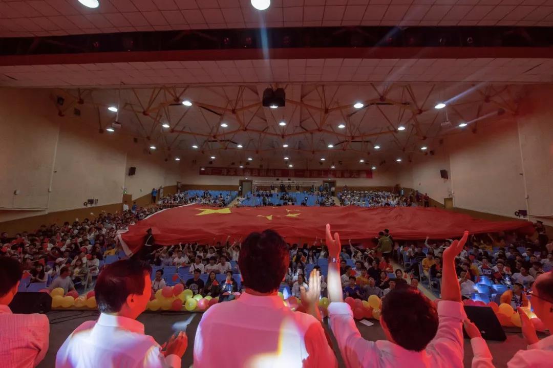 晚会最后以一曲《我和我的祖国》为晚会划上了完美的句点。受到深情演唱的感染,在场师生纷纷起立,挥舞手中的红色国旗一同合唱,掀起了晚会节目的最高潮。