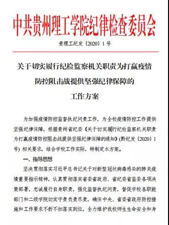 印发贵州理工学院纪委《关于切实履行纪检监察机关职责为打赢疫情防控阻击战提供坚强纪律保障的工作方案》。坚决贯彻落实习近平总书记关于对新型冠状病毒感染的肺炎疫情重要指示精神,认真贯彻落实省委省政府、省纪委省监委各项决策部署,忠诚履行自身职责,强化监督执纪问责,督促学校各职能部门和二级学院切实守责负责尽责,确保中央、省委省政府防控措施和工作要求不折不扣落实到位,全力维护乐游棋牌师生生命安全和身体健康,为打赢疫情防控阻击战提供坚强的纪律保障。