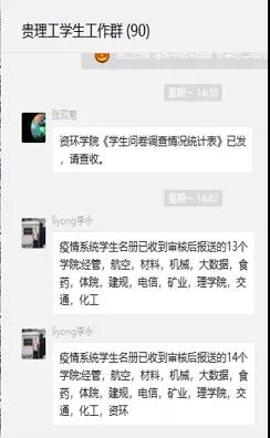 非常时期,学生工作部统筹调度全校学生管理工作队伍,进一步严明纪律、严格要求、严守防线。成立“学生工作部(处)应对新型冠状病毒感染的肺炎疫情防控工作领导小组”,在学校疫情防控工作领导小组领导指挥下统筹全校学生管理工作抗击疫情相关事宜;明确各招生学院分管学生工作院领导为学院疫情防控学生管理工作直接责任人,负责本院学生疫情防控工作的部署落实及相关信息报送的审定职责;各招生学院学生科负责人为学院疫情防控学生工作第一联络人,负责协调组织本院辅导员、班主任开展相关工作,按要求报送学生相关信息,同时确保各项工作要求及时通知到所在学院的每位同学;班主任通过qq、微信深入班级,和学生建立密切联系,全面掌握班级学生情况,配合辅导员做好防控期间所负责班级学生的思想教育和引导工作。