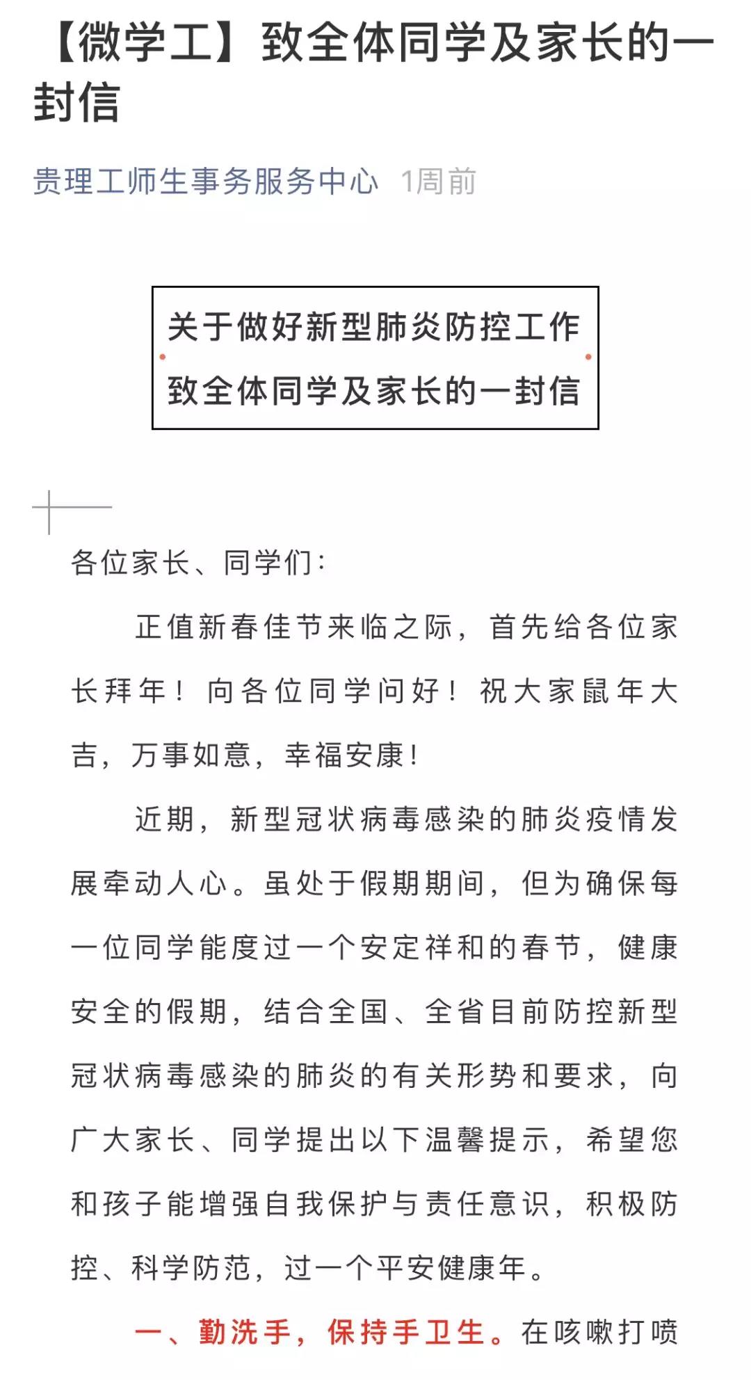 发布《致全体学生及家长的一封信》;开展“理工战‘疫’?共克时艰”作品征集活动;开通心理危机干预微信平台、QQ群,开展线上心理辅导及心理危机干预工作;制定校内专项资助方案,对因疫情导致家庭经济困难的学生予以及时资助。面对疫情、面对广大师生安全与学校安全稳定,学工战线一直在努力,用我们的方式传递爱、传递信心、传递力量!