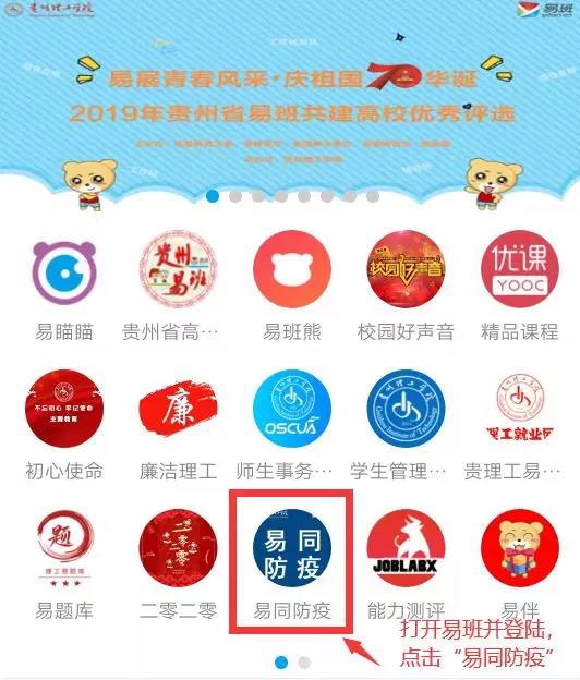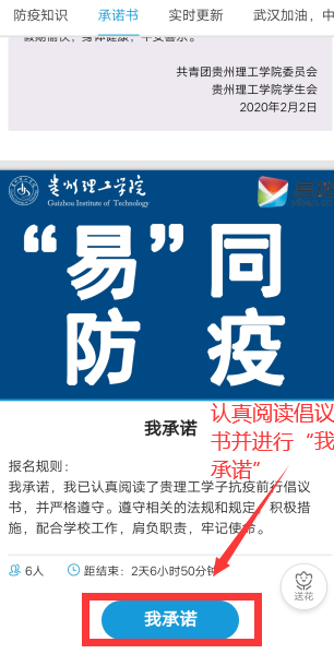 现正值学校寒假,但疫情防控应防范于未然,做好学校的防控工作,校团委、校学生会、易班共同推出“易”同防控承诺书,邀请各位理工学子积极响应参与,一起做好校园防控,保护自己,同时也对他人负责。请各位理工学子登录易班,按照以下操作进行: