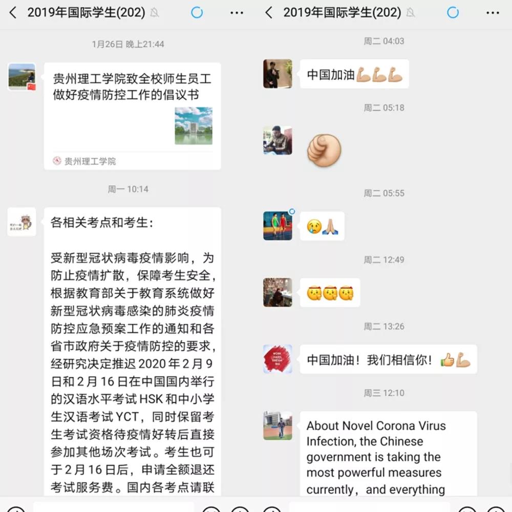 在防控工作中,各班班主任立即清查学生情况,第一时间掌握全体国际学生动态;值班员教师24小时电话坚守岗位,实时与各班主任、国际学生助管联系,国际教育学院教师及时收集相关疫情防控知识多语种版和关键信息推送给学生和外教。通过短信、QQ、微信、公众平台及时发布告知书、倡议书与疫情消息、班级微信群宣传推广,实时提醒相关注意事项,通报疫情情况,倡导大家积极抗击疫情。同时,每天追踪国际学生及外籍教师的地理位置与身体状况,确保其无异常情况并按时上报。