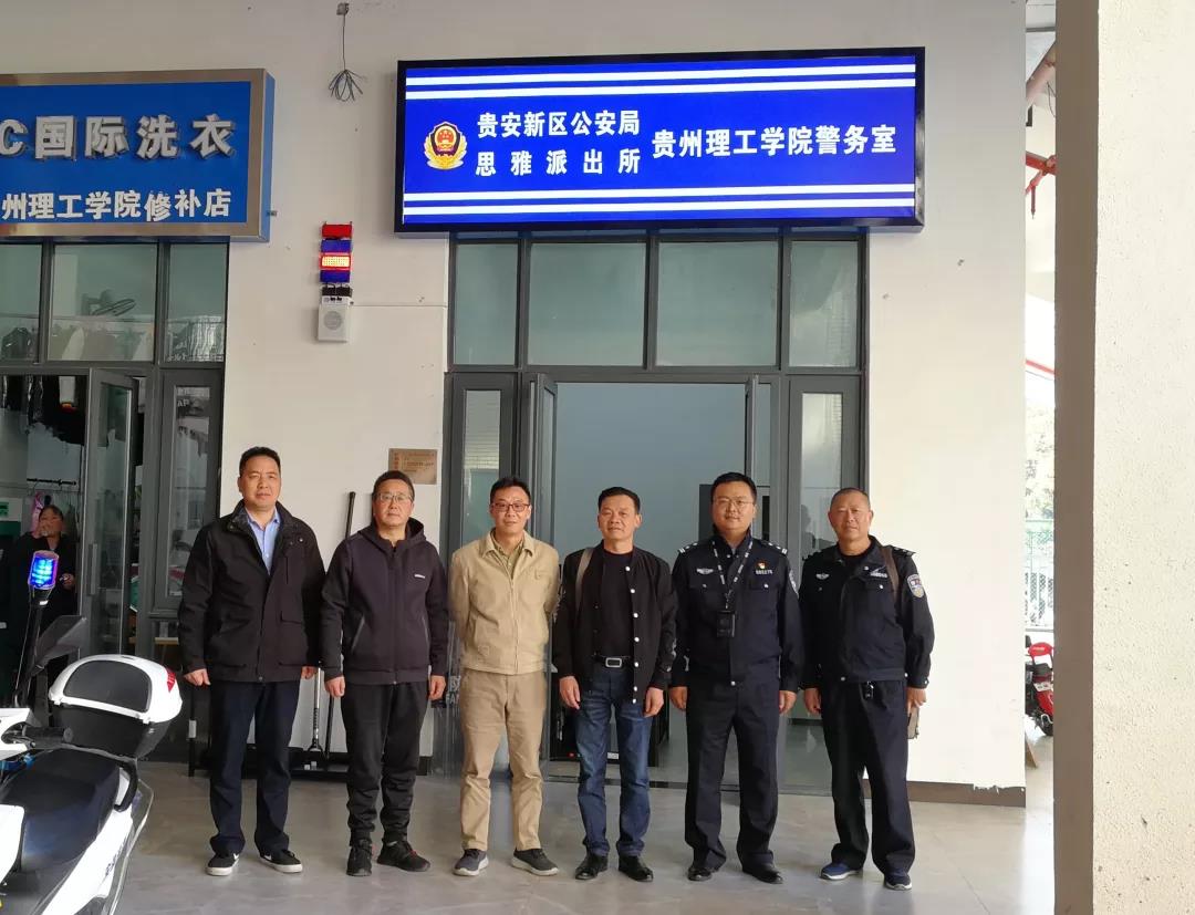 党委副书记高勇、思雅派出所所长周国龙、乐游棋牌保卫处负责人共同为“贵州理工学院警务室”揭牌,出席揭牌仪式的还有大学城管片民警、驻点贵安校区华威保安公司负责人。