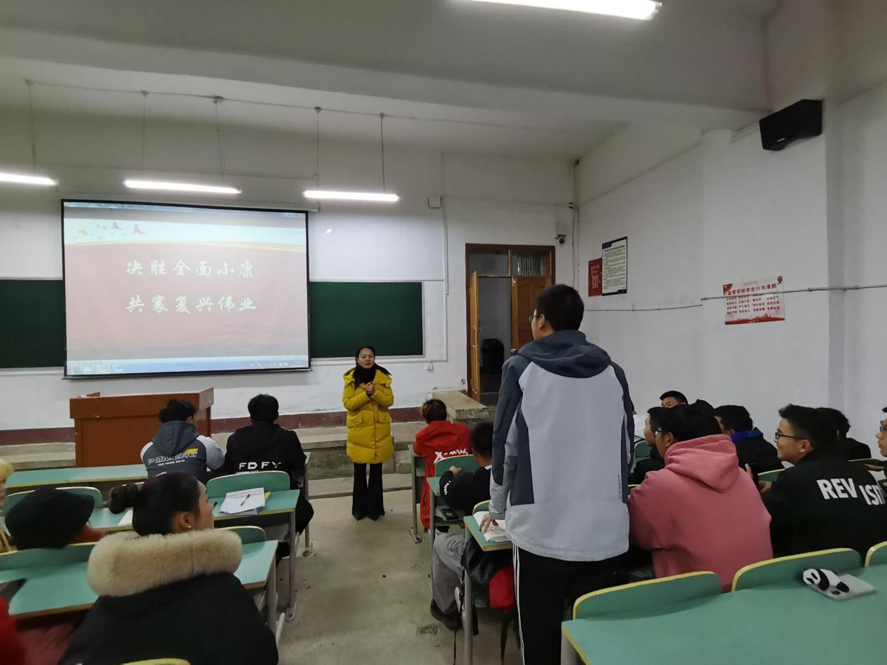 贺梦依书记紧紧围绕课程主题,以通俗易懂的方式详细阐述了我们国家全面建成小康社会的伟大意义和内涵,并且用“数字变化看贵州”系列,引用大量脱贫前后对比图片,向同学们介绍了贵州脱贫攻坚取得的成绩,以同学们的家乡人家乡事为例,将黄大发、邓迎香、六盘水岩博村以及安顺塘约等贵州本地脱贫攻坚事例和人物作为典型,引起了同学们的强烈共鸣。最后,贺梦依书记引用新时代习近平总书记对青年们的寄语,介绍了新时代大学生为中华民族的复兴应当肩负的使命和担当的责任,结合两个专业的特点提出了今后立志立德的具体要求。