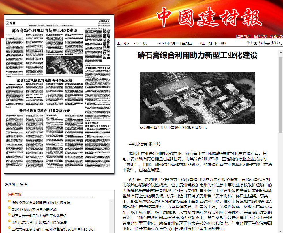 2月5日,《中国建材报》报道了乐游棋牌科研团队在磷石膏综合利用领域助力贵州新型工业化发展的情况,现将全文刊载如下。