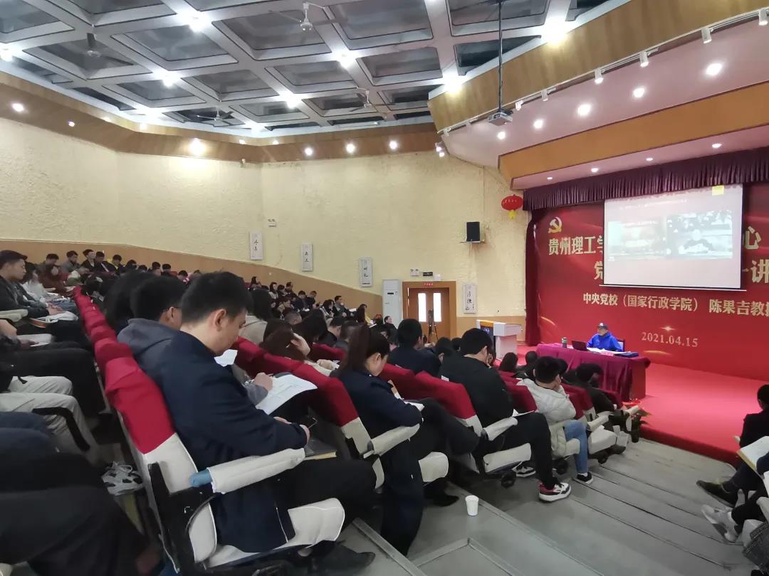 陈果吉教授作了题为《中国共产党领导中国人民和中华民族站起来、富起来、强起来的辉煌历程》专题辅导报告。报告从“中国共产党成立时中国的基本状况”、“中国共产党领导中国人民百年走过的发展历程”、“百年来,中国共产党带领中国人民和中华民族实现的三大基本目标”、“百年历程的成功经验”四个方面,回顾了从党的一大到十九大的光辉历程;梳理了中国共产党从小到大、从弱到强,波澜壮阔的伟大征程;深刻分析了中国共产党诞生前中国社会的基本状况、主要矛盾和历史任务,从新民主主义革命时期、社会主义革命与建设时期、改革开放与社会主义现代化建设新时期、中国特色社会主义新时代几个方面概述了中国共产党领导中国人民从站起来、富起来、强起来的百年辉煌历程。他强调,只有中国共产党才能救中国、只有中国共产党才能领导中国。百年来,中国共产党人一直用实际行动,践行着“为中国人民谋幸福,为中华民族谋复兴”的初心和使命。正是在初心使命的感召和指引下,中国共产党带领中国人民在抗疫斗争中取得了重大战略成果,在脱贫攻坚战中取得了全面胜利,在全面建成小康社会的努力中取得了伟大历史性成就,人民生活水平不断提高。这充分彰显了,中国共产党领导的政治优势和中国特色社会主义的制度优势。