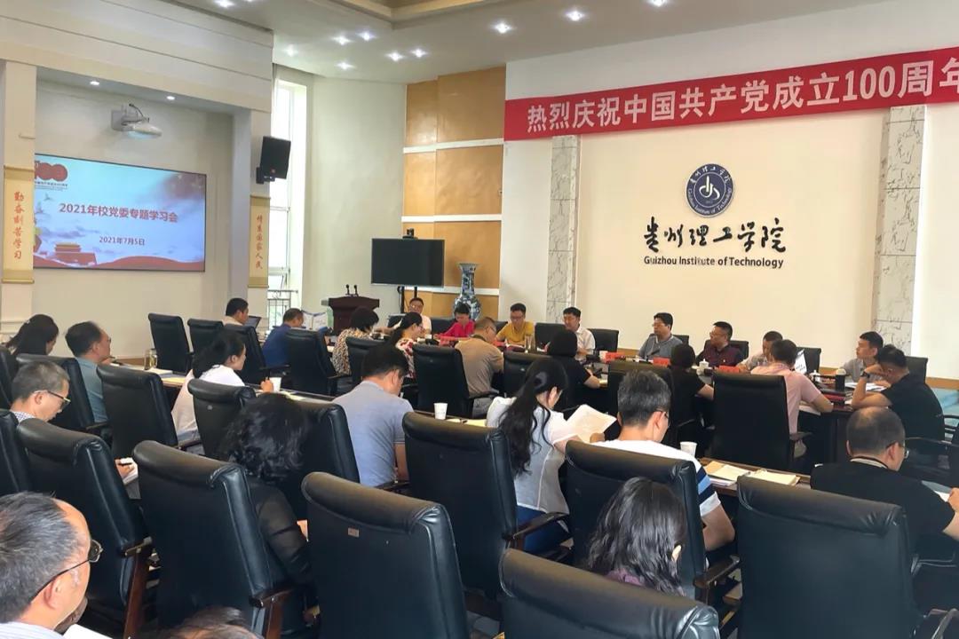 本网讯(党委办公室)7月5日上午,贵州理工学院在喀斯特会议厅召开党委会议,专题学习习近平总书记在庆祝中国共产党成立100周年大会、“七一勋章”颁授仪式上的重要讲话精神,谌贻琴书记在省庆祝大会上的讲话精神,研究学校贯彻落实举措。校党委委员曾羽、苏向东、高勇、胡兴灿、贺梦依、林长松、张开智、李朋出席会议,校直各部门、各教学(教辅)机构党政主要负责人参加会议。党委书记曾羽主持并讲话。