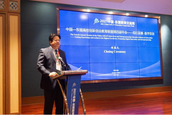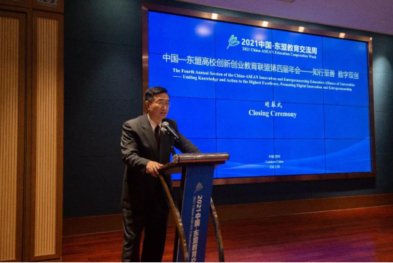 闭幕式上,教育部中外人文交流中心主任杜柯伟致辞,他表示,一个时期以来,中国与东盟在语言学习、联合科研、双向办学、师生交流等方面合作取得长足进展,“中国-东盟教育交流周”成为双方教育人文交流的名片,中国-东盟高校创新创业教育联盟发挥了重要作用,做出了积极贡献。倡议有关各方提高工作站位,以人文交流理念为引领,团结带动中国和东盟国家更多高校,密切关注和联系产业、行业和企业,既开展创新创业教育理论研究,又在实践中促进创新创业教育与专业的结合、与数字经济的融合,积极与世界上其他国家和地区开展交流互鉴,及时总结经验、研制标准、提高质量,将联盟和联盟活动打造成为中国—东盟教育合作、人文交流的品牌项目,为促进中国—东盟国家民心相通、人民友好发挥更大的作用。