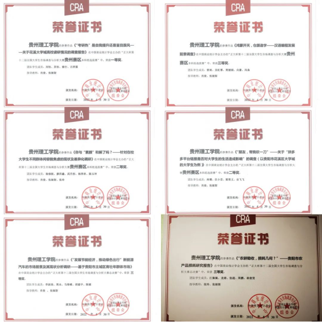 本次大赛全国共有815所高校,17.4万名大学生报名参加,贵州理工学院大数据学院40余名学生报名参赛,最终由38名学生组成的9支队伍荣获佳绩。其中,由李波浪、周永、马烽啸、胡建宇,林俊贤、周鹏、张超、龙涛、江佩佩同学组成的2支队伍的参赛作品《“发展节能经济,推动绿色出行”新能源汽车的市场前景及其现状分析调研---基于贵阳市主城区青壮年群体市场》和《“农耕锄收,损耗几何?”---贵阳市农产品损耗研究报告》分别获得国家级三等奖;另有2支队伍荣获省级一等奖,3支队伍荣获省级二等奖,2支队伍荣获省级三等奖。