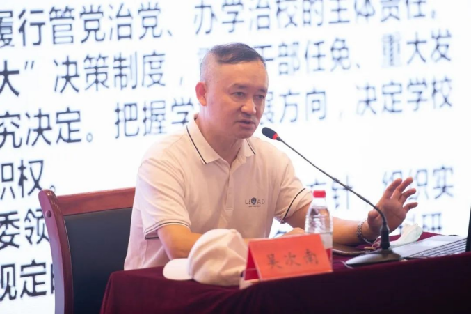 党委副书记吴次南作题为《处理好新时代学校发展的几个关系》专题辅导,以高等教育发展为主线,结合自己多年的工作经验和工作思考,围绕党的建设与业务发展、以本为本与硕士点建设、传承与创新、管理与教学4个方面进行授课。