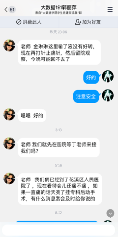9月6日凌晨2点,一位女同学由于肾结石而疼痛难忍,在花溪大学城医院治疗后依然无法缓解,父母由于疫情封控无法赶来。情急之下,李刚向学院领导和学工部驻守贵安校区的副部长邹勇报告,商量对策。经过多方尝试,终于120接线员为这名女同学争取了一辆大学城医院救护车,护送了学生去花溪人民医院医治。早上5点,学生进入花溪区人民医院,经过治疗终于减少了疼痛。