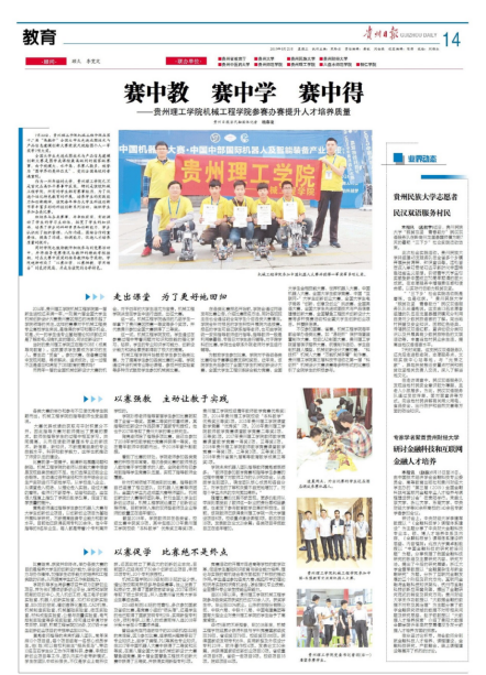 学院党总支始终把学风建设作为提高学生综合素质的主要途径,推动了全员育人、全面育人、全程育人格局的形成。学院充分发挥党建育人功能,将党建与学生发展相融合。2名学生党员获“全国优秀共青团员”荣誉称号,3名同学入选“贵州省百佳优秀大学毕业生事迹选编”,20多人获“贵州省优秀学生干部”、“贵州省三好学生”荣誉称号。学生在诸多世界级、国家级、省级、校级赛事中屡获佳绩,世界机器人大赛、中国机器人大赛等国家级以上奖项及荣誉126项,获得机械设计大赛等省级奖项150余项。机自132班团支部获2015年“全国五四红旗团支部”和2016年“全省五四红旗团支部”,机控132班团支部获全省五四红旗团支部,制测141班、机自181班获省级优秀班集体。学院团总支获省级五四红旗团总支荣誉称号。乐游棋牌8月21日《乐游棋牌》围绕学院“以赛促学、以赛促教、以赛促用”的办学特色进行了整版报道。