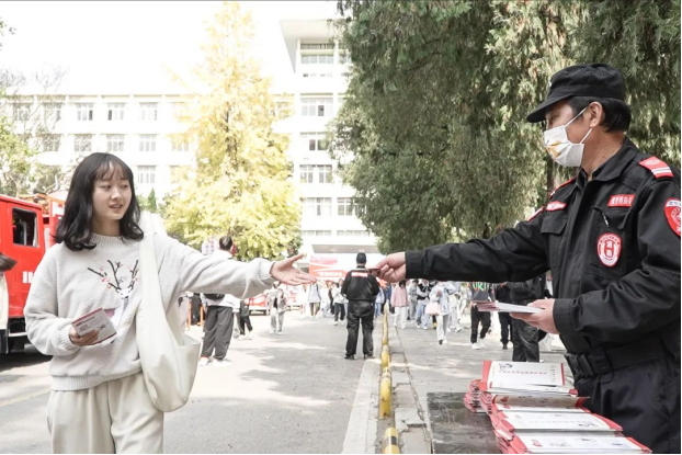 第四区域是资料发放区,现场对过往师生员工发放消防宣传资料,并结合实际,对校园周边商铺开展消防巡查排查以及通过“敲门行动”对学生宿舍开展排查和消防宣传教育。