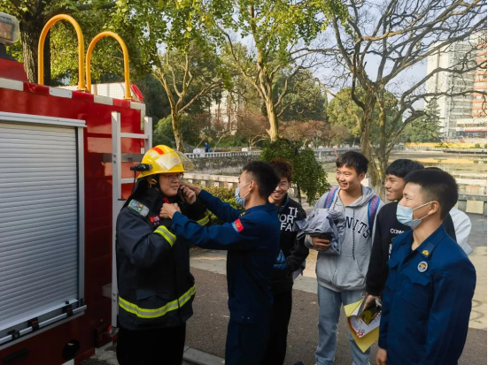 第三展区是器材展示区,同学们参观了先进的消防器材装备,并现场进行逃生面罩使用演示以及灭火器使用讲解与演示,让同学们亲身体验。