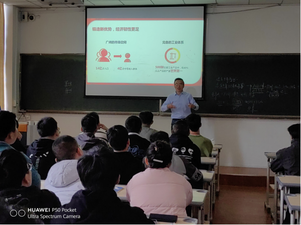 张开智以多年的专业教学经验和从事高校管理工作的实践经历,从专业角度结合中国经济绽放的新气象生动讲解,既引经据典,又分析透彻,让大四学生结合所学专业知识引发思考,增强志气、骨气、底气,持续提升自信心、自豪感,帮助大四学生清晰认识到现阶段大学生的责任与担当,并就此话题与学生们展开互动讨论。