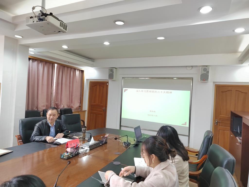 本网讯(食品药品制造工程学院 谢述琼)为深入学习宣传贯彻党的二十大精神,2022年11月18日下午,副校长林长松在综合楼五楼会议室宣讲党的二十大精神,国际交流合作处(国际教育学院)、国有资产管理处、后勤管理处、食品药品制造工程学院、外国语学院党员、教师代表参加宣讲会。