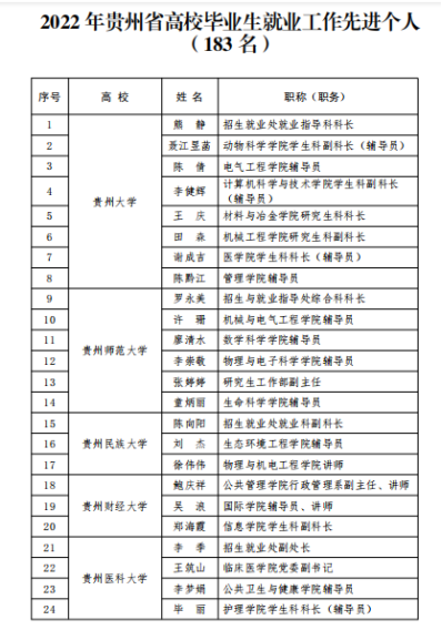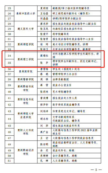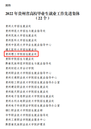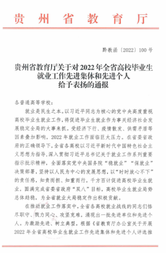 本网讯(招生就业处 崔美娟)近日,根据《省教育厅办公室关于开展2022年全省高校毕业生就业工作先进集体和先进个人评选推荐活动的通知》要求,经专家评审公示,贵州理工学院招生就业处获得“2022年贵州省高校毕业生就业工作先进集体”荣誉称号。材料与能源工程学院学生科副科长、就业工作人员蔺锡柱和理学院学生科副科长、就业工作人员张梦2人荣获“2022年贵州高校毕业生就业工作先进个人”称号。