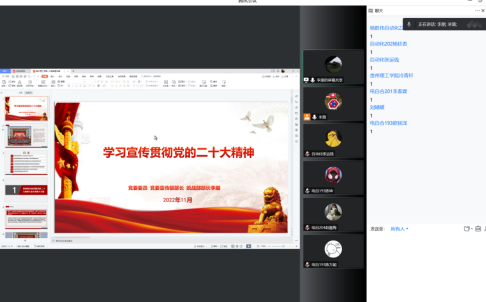 本网讯(人工智能与电气工程学院 顾英)2022年12月6日晚20点,校党委委员,党委宣传部、统战部部长李朋通过腾讯会议以题为“学习宣传贯彻党的二十大精神”对人工智能与电气工程学院学生党支部开展主题党课线上讲座。讲座由学生党支部书记主持。